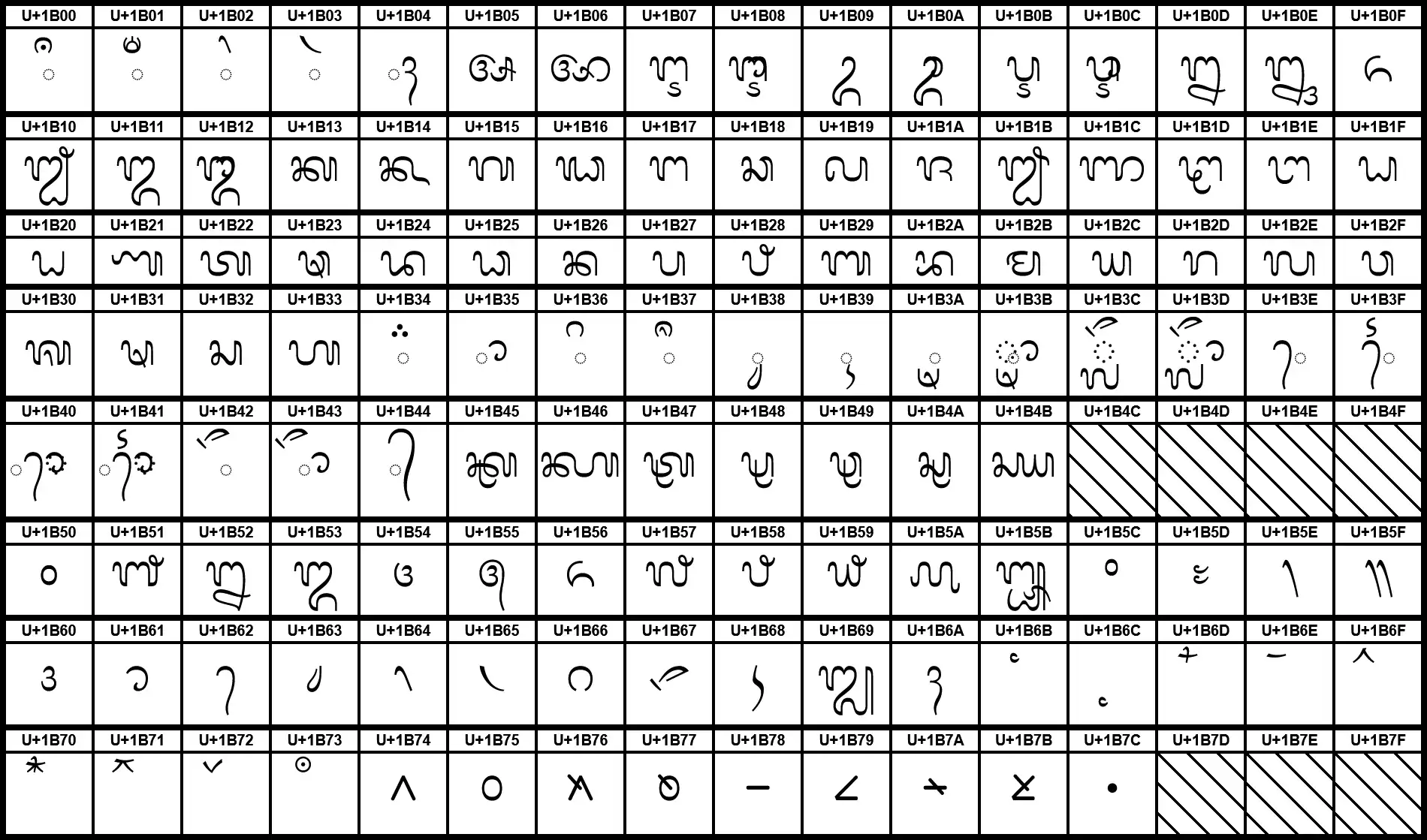 | U+1B33 (6963) | ᬳ | anderer Buchstabe, Silbe oder Ideogramm | links nach rechts | BALINESE LETTER HA | Balinesischer Buchstabe Ha |