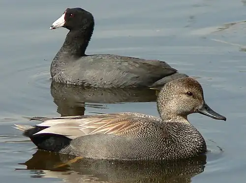 Männchen der Schnatterente (Anas strepera; vorn) mit Indianerblässhuhn (Fulica americana) auf dem West Pond im UBNA | ||