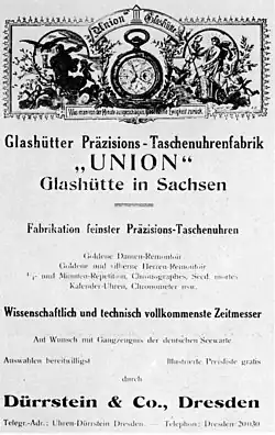 - ↑ Hans-Georg Donner: Glashütter Uhrenfabrik Union Dürrstein & Co 1893-1936. Abgerufen am 25. März 2019.