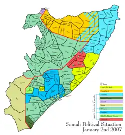 Derweil drang die Union islamischer Gerichte weiter gegen die international anerkannte, aber weitgehend machtlose und von ihr abgelehnte Übergangsregierung Somalias mit Sitz in Baidoa vor. Verhandlungen zwischen beiden Parteien in der sudanesischen Hauptstadt Khartum[3] blieben erfolglos. Im August 2006 weitete die Union ihre Kontrolle über die autonomen Regionen Puntland und Galmudug im Nordosten aus. Mitte 2006 konnte die Union die Kontrolle über die Landeshauptstadt Mogadischu und große Teile Süd- und Zentralsomalias erlangen.
