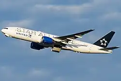 Im Jahr 1995 stellte United Airlines die damals neue Boeing 777-200 in Dienst, an deren Entwicklung die Gesellschaft maßgeblich beteiligt war. Ab Ende 1995 bot United nach dreijährigem Widerstand durch die eigenen Piloten als damals einzige Fluggesellschaft der Welt durch die Aufnahme von Neu-Delhi als Zielort planmäßigen Rund-um-die-Welt-Flugverkehr (around-the-world-service) von Los Angeles über Newark, London, New Delhi und Hong Kong zurück nach Los Angeles (jeweils in westlicher und östlicher Flugrichtung mit der durchgehenden Flugnummer „1“ beziehungsweise „2“) auf United-Maschinen an.[30] Zuvor hatte nur Pan Am von 1947 bis 1982 Flüge rund um die Welt mit eigenen Linienflügen angeboten.[31][32] 1999 wurde der Flugdienst nach Neu-Delhi, und damit der Rund-um-die-Welt-Flugverkehr, aufgrund der Asienkrise vorübergehend eingestellt, 2001 wieder aufgenommen und wenige Jahre später endgültig beendet.[33] Im Mai 1997 gründete United Airlines zusammen mit Lufthansa, Air Canada, SAS und Thai Airways die Star Alliance, wobei United Ende der 1990er Jahre als größte Fluggesellschaft der Welt galt, bis sie im Januar 2001 von American Airlines durch deren Fusion mit Trans World Airlines (TWA) überholt wurde. Die Zeit zwischen 1995 und dem Ende der 1990er Jahre war, auch aufgrund der New Economy, wirtschaftlich erfolgreich für United Airlines. 1997 erreichte der Aktienkurs von United knapp die 100 Dollar-Marke und das Unternehmen beschäftigte in diesen Jahren knapp 100.000 Mitarbeiter.