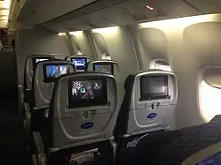 - United rüstete sukzessive die vorderen Reihen der Economy-Kabinen ihrer gesamten Flotte um und richtete als Premium Economy Class sogenannte Economy-Plus-Zonen ein, die sich vom Rest der Kabine durch mehr Beinfreiheit (etwa 12 cm) unterscheiden und als Bindeglied zwischen der Economy und der Business-Klasse fungieren sollen. Das Economy-Plus-Projekt war bereits 1999 gestartet worden.[43] Diese Sitzreihen sind grundsätzlich für Vielflieger und Inhaber teurer Tickets reserviert. Gegen Aufpreis können allerdings auch Passagiere mit ermäßigten Tickets Economy-Plus-Sitze erwerben, falls jene kurzfristig noch verfügbar sind.