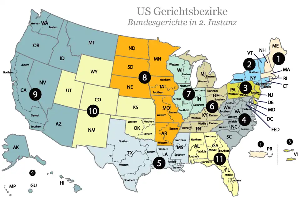 Es existieren zurzeit dreizehn allgemeine Berufungsgerichte, also solche, deren Zuständigkeit sich auf ein geografisches Gebiet und nicht auf eine bestimmte Sachmaterie (subject matter) bezieht. Zuständig sind die zwölf jeweils für einen Gerichtsbezirk (circuit, deshalb auch circuit court oder auch schlicht circuit). Elf davon tragen Nummern (das entsprechende Gericht heißt dann etwa United States Court of Appeal for the Tenth Circuit). Dazu kommt das Gericht für den District of Columbia mit der Bundeshauptstadt Washington, dessen herausragende Bedeutung sich aus seiner Zuständigkeit für die vielen dort ansässigen Bundesbehörden herleitet.