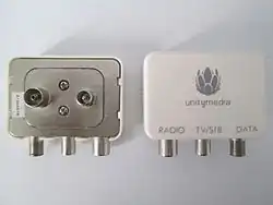 - eine Multimediadose (MMD) mit drei bzw. vier Anschlüssen für Fernsehen, Radio und Datenkommunikation oder einen entsprechenden Adapter (POA).