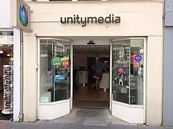 Die Unitymedia GmbH war ein deutscher Kabelnetzbetreiber mit Sitz in Köln, der ursprünglich 2005 durch den Zusammenschluss von iesy, ish und Tele Columbus West entstand.[3] Von 2009 bis 2019 war das Unternehmen über die niederländische UPC Germany Holding BV[4] eine Tochtergesellschaft von Liberty Global. Im Jahr 2011 wurde der Kabelnetzbetreiber Kabel BW von Liberty Global übernommen und beide Unternehmen am 8. August 2012 unter der Holding Unitymedia KabelBW GmbH zusammengeführt.[5] Im Dezember 2018 wurde bekannt, dass Liberty Global das Tochterunternehmen ausgenommen haben soll. Liberty hat in einem Zeitraum von acht Jahren 3,8 Milliarden Euro bei Unitymedia abgeschöpft. Der damalige Kaufpreis betrug 2,1 Milliarden Euro. Im selben Zeitraum zahlte Unitymedia in Deutschland nur gut 50 Millionen Euro an Unternehmensteuern. Die damalige Muttergesellschaft hat Unitymedia die Zinsen für die Übernahmekredite und mehr in Rechnung gestellt.[6] Seit der Einstellung der Marke Kabel BW zum 1. April 2015 verwendete das Unternehmen ausschließlich Unitymedia als Firmierung und Marke.[7] Das Unternehmen hatte 7,1 Millionen Kunden in den Bundesländern Baden-Württemberg, Hessen und Nordrhein-Westfalen. 6,4 Millionen Kunden haben Kabelfernsehen, 3 Millionen Telefon und 3,2 Millionen Internet bei 12,9 Millionen per Kabel versorgbaren Haushalten.[8]