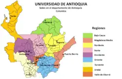 Sitz ist Medellín. Weitere Standorte sind Caucasia, Puerto Berrío, Amalfi, Segovia, Yarumal, Santa Fe de Antioquia, El Carmen de Viboral, Andes und Turbo.[1]