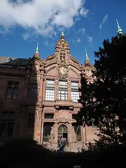 Der Bau ist vom Stilpluralismus des Späthistorismus geprägt. Elemente der deutschen und französischen Renaissance sind mit der Formensprache des Jugendstils verbunden. Dazu gehören eine Darstellung von Prometheus mit dem Adler links des Haupteingangs und eine verschleierte Jungfrau rechts davon. Über der schmiedeeisernen Tür prangt der pfälzische Löwe mit der Aufschrift Universitätsbibliothek.[2] Den zentralen Giebel der Hauptfassade schmückt eine Kopfskulptur von Pallas Athene, am Giebel der Westfassade findet sich eine Darstellung des Weltgeistes, über dessen Haupt Blattwerk, eine Weltkugel und neun Sternen angeordnet sind.[3]