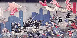 Die 200 Krieger belagern die Burg Kumamoto in der Nacht des 24. Oktober 1876 und teilen sich in drei Einheiten auf: