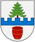In Silber ein oben gezinnter blauer Balken, aus dem ein breiter grüner Nadelbaum wächst, darunter ein rotes Salzfass.[2]