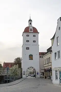 Der fünfgeschossige Bau (Höhe 35 Meter) auf quadratischem Grundriss steht an der Südostecke der mittelalterlichen Stadt. Der Torbogen dient als Durchfahrt für die vom Marktplatz ausgehende Straße nach Lauingen. In der Durchfahrt ist eine Stichbogentonne, feldseitig ein Stichbogen aus Kalksteinquadern. Der Bogen ist im oberen Teil gefast und besitzt an den Außenseiten der Fasen kleine Masken. Die Wände des Torturms sind verputzt, am unteren Teil sind unter dem Putz Bossenquader sichtbar. An den beiden obersten Geschossen sind außen und innen je zwei Blendfelder, in denen sich auf jedem Geschoss je ein Fenster mit Laden befindet. Feldseitig ist auf mittlerer Höhe eine Kielbogenblende angebracht, die mit einem modernen Stadtwappen aus Kacheln versehen ist.