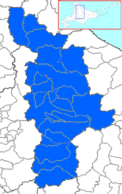 Liste der Landkreise der Unterpräfektur Kamikawa, sowie deren Städte (町, chō) und Dörfer (村, mura).