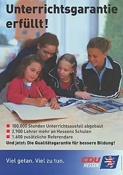 Nach der Landtagswahl 1999 konnte die CDU gemeinsam mit der FDP eine Regierung bilden. Es wurden daraufhin 3000 zusätzliche Lehrerstellen geschaffen, von denen allerdings wegen der später eingeführten Arbeitszeitverlängerung der hessischen Beamten ca. 1200 Stellen wieder entfielen.