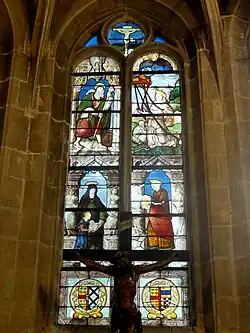 Im Maßwerk ist die Kreuzigung Christi dargestellt. Am unteren Rand sind die Wappen des Stifterehepaars, François de Montmorency und Catherine de Humières, zu sehen.