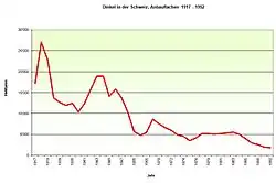 Anfang des 20. Jahrhunderts betrug die angebaute Dinkelfläche in der Schweiz durchschnittlich 16'000 Hektaren pro Jahr. Bis zum Jahr 1993 ging diese Fläche kontinuierlich bis auf 1000 Hektaren zurück.[2] Gründe dafür waren die Mechanisierung der Landwirtschaft und der wachsende Anbau von Weizen. Auch bestand der grösste Teil des verbleibenden Dinkels aus Kreuzungen mit Weizen, da nur so der Ertrag einigermassen mit dem von Weizen mithalten konnte.[3]