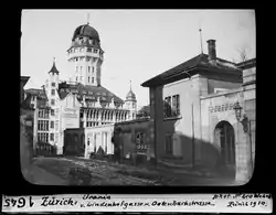 Die Urania-Sternwarte war der erste Betonbau, der in Zürich errichtet wurde. Der 51 Meter hohe Turm wurde ohne Verbindung zum übrigen Haus erstellt. Er stand auf einem Fundament von 48 Holzpfählen, die 12 Meter tief in den Baugrund aus Seekreide gerammt wurden, bis sie auf Fels stiessen. Darüber lag eine gegossene und erschütterungsfreie Betonplatte, die den Sockel des Teleskops trug.[2] Am Samstag, dem 15. Juni 1907 fand die Eröffnung des Geschäftshauses und der Volkssternwarte statt. Seither gehört der rund 51 Meter hohe Turm zu den markantesten Bauten am westlichen Ende der historischen Altstadt[3] und steht seit 1989 unter Denkmalschutz.