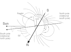 Uranus’ Magnetfeld, wie es 1986 von Voyager 2 gesehen wurde: N und S sind der magnetische Nord- und Südpol.
