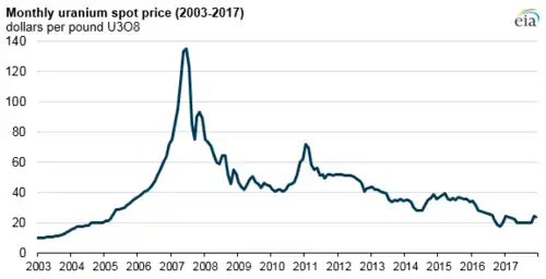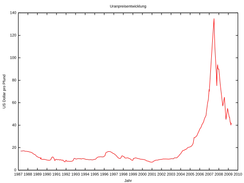 Der Weltmarkt für Uran war und ist neben den kommerziellen Marktteilnehmern sehr stark durch staatliche Akteure geprägt, die zur Zeit des Kalten Krieges einen Teil der Nachfrage stellten und seit dessen Ende im Rahmen begrenzter Abrüstung als Verkäufer auftreten. Ein Großteil des Marktvolumens ist über langfristige Lieferverträge in US-Dollar abgedeckt. Nur ein sehr geringer Teil des jährlichen Bedarfs wird über den Spotmarkt umgesetzt. Dort sind auch Preisschwankungen möglich. Beispielsweise führten Produktionsausfälle in wichtigen Minen im Sommer 2007 zu einem Allzeithoch von 350 $/kg Uran, inzwischen ist der Uranpreis jedoch wieder zurückgegangen.[19]