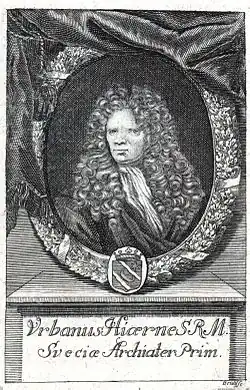 Urban Hjärne war der Sohn des lutherischen Pfarrers Erland Jonsson (Erlandus jonae) Hiärne und der Christina Schmidt. Mit 16 Jahren ging er nach Stockholm, wo er wegen der herrschenden Pest nicht bleiben konnte. So besuchte er das von Gustav Adolf gegründete Regium Gustavianum Gymnasium Strengnese i Roggeborgen, das heutige Thomasgymnasium in Strängnäs, wo ihn der Rektor Johann Tranäus aufnahm, und studierte dann an der Universität Tartu (zugelassen 1655). Von dort floh er 1657 wegen des Zweiten Nordischen Krieges nach Schweden, wo er an der Universität Uppsala als Schüler von Olof Rudbeck dem Älteren und Petrus Hoffvenius Medizin studierte, diese unterstützte er im Cartesianismus. Er wurde dann Leibarzt in Riga für den Grafen Clas Tott. Er bereiste 1667 Deutschland und Holland und wurde in die Royal Society gewählt. Im Jahre 1670 wurde er an der Universität Angers mit der Arbeit De obstructione lacteorum Vasorum et Glandularum Mesenterii zum Doktor der Medizin ernannt. Danach war er über zwei Jahre in Paris zu Studienzwecken und erst 1674 wieder als praktischer Arzt in Schweden. Im Jahre 1678 entdeckte er in dem Wasser aus dem Gut Medevi nördlich von Motala eine lange Zeit verschüttete Mineralquelle, einen eisenhaltigen Sauerbrunnen, wieder. Der Ort wurde ein beliebtes Heilbad. Er war dort bis 1682 Arzt und untersuchte auch weitere Mineralquellen in Schweden.[1] Ab 1683 war er Assessor am Bergkollegium. Er besuchte die Salzquellen in Lüneburg und Bergwerke im Harz, in Böhmen und Norwegen.