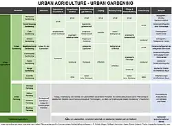 Urbane Landwirtschaft (engl. urban agriculture oder urban farming) ist ein Oberbegriff für verschiedene Weisen der primären Lebensmittelproduktion in städtischen (urbanen) Ballungsgebieten und deren unmittelbarer Umgebung für den Eigenbedarf der jeweiligen Region.[1] Er umfasst neben städtischen Formen des Gartenbaus auch Tierhaltung in urban geprägten Gebieten. Der Begriff geht über die bekannten Formen des urbanen Gartenbaus (Hausgarten, Kleingarten, Grabeland) hinaus und beinhaltet z. B. auch Ackerbau, Tierhaltung (Geflügel, Hauskaninchen, urbane Imkerei[2] oder Aquakultur/Aquaponik), sofern sie im Stadtgebiet und peri-urbanen Zonen betrieben werden. Dabei sind die Formen urbaner Landwirtschaft an keine besondere Rechtsform (privat, gemeinschaftlich) oder sozioökonomische Intention (Selbstversorgung, Marktproduktion, sozialer Tausch) gebunden.