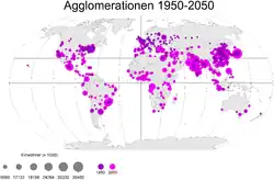 Seit dem Jahr 2008[11] wohnt mehr als die Hälfte der Weltbevölkerung in Städten, während 1950 noch 70 % auf dem Land lebten. Nach Prognosen der UNO wird der weltweite Anteil der städtischen Bevölkerung bis 2030 auf über 60 % steigen und im Jahr 2050 rund 70 % erreichen. Weltweit gibt es über 63 Städte mit mehr als drei Millionen Einwohnern.