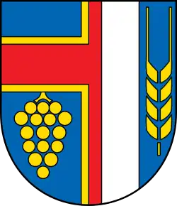 Blasonierung: „Blau, durch ein halbes goldenes Hochkreuz nach rechts, bedeckt mit einem halben roten Hochkreuz und einen silbernen Pfahl links zweimal gespalten, links im unteren blauen Feld eine goldene Traube, rechts in der blauen Flanke eine goldene Ähre.“ |