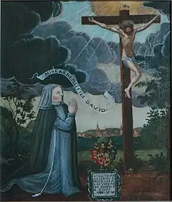 Zum Totengedächtnis für die Äbtissin Ursula zu Mecklenburg entstand vermutlich 1586 das kleine in Öl auf Leinwand im Original-Holzrahmen (H 81 cm, B 66 cm) gemalte Epitaphbild. Gemalt wurde es möglicherweise von einem am Güstrower Hof Herzog Ulrichs tätigen Porträtmaler aus dem Umkreis des Cornelius Krommeny.[10] Das Bild ist unsigniert und vielleicht nur eine zeitgenössische, laienhafte Kopie für das Kloster Rühn, das Herzog Ulrichs Frau Elisabeth in ein Damenstift umgewandelt hatte.[11] In seiner Gestaltung steht das Bild in der Tradition von Lucas Cranach d. Ä. um 1520/30 gemalten Bildnisses von Kardinal Albrecht von Brandenburg (Alte Pinakothek München), das bis in das 17. Jahrhundert die Epitaphmalerei prägte. Die verstorbene Äbtissin kniet betend im Habit der Klarissen mit gefalteten Händen vor dem toten Christus am Kreuz und fleht: MISERE MEI FILI DAVID. (Erbarme dich meiner, Sohn Davids). Das Kreuz bestimmt die rechte Hälfte des Bildes. Christus hängt mit angezogenen Beinen am Kreuz, erinnernd an mittelalterliche Darstellungen schmerzhafter Kruzifixe. Ein Scheibennimbus hinterfängt das Haupt. Strahlen, die vom unsichtbaren Gottvater in den Wolken ausgehen, treffen als Lichtzeichen Christus und Ursula. Im Hintergrund ist Ribnitz zu sehen. Es ist die älteste bekannte Darstellung der Stadt. Unter dem herzoglich mecklenburgischen Wappen im Vordergrund steht in einer Roll- und Beschlagwerkkartusche: V.G.G. VRSVL A.G.H.Z.M.F.Z.W.G.Z.S.D.L.R. V.S.F. VND DOMINA. Z. RIBNITZ. STARB. .ANNO 15.86. (Von Gottes Gnaden Ursula, geborene Herzogin zu Mecklenburg, Fürstin zu Wenden, Gräfin zu Schwerin, der Lande Rostock und Stargard Frau, Domina zu Ribnitz). Der Maler war bemüht, die helle Gesichtsfarbe mit den roten Wangen möglichst getreu wiederzugeben.[12]