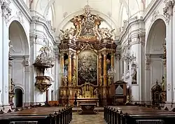 In der einschiffigen, dreijochigen Saalkirche befinden sich an den Seitenwänden je drei hohe Nischen für die Altäre.