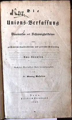 - ↑ Alexa Geisthövel: Eigentümlichkeit und Macht. Deutscher Nationalismus 1830–1851. Der Fall Schleswig-Holstein (= Historische Mitteilungen der Ranke-Gesellschaft. Beihefte. Bd. 50). Steiner, Wiesbaden 2003, ISBN 3-515-08090-2, S. 27. Zu Lornsens Schrift eingehend ebda., S. 28–42.