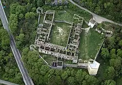 Luftbilder der Burgpalast-Ruine (die als Hotel rekonstruierte Burg rechts):