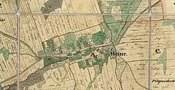 Im Jahre 1835 bestand Weine aus 25 Häusern mit 170 deutschsprachigen und katholischen Einwohnern, die von der Landwirtschaft lebten. Im Ort gab es einen Erbrichter, zwölf Halbbauern, drei Viertelbauern, drei Gärtner und zwei Häusler. Pfarr- und Schulort war Markt Roßwald. Die Nutzfläche umfasste 400 Joch fruchtbares Ackerland, 120 Joch Wiesen und 100 Joch Wald.[2] Das Dorf war Teil der großen mährischen Enklave Hotzenplotz. Bis zur Mitte des 19. Jahrhunderts blieb Weine der Lehnsherrschaft Roßwald untertänig.