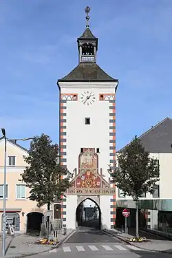 Unterer Stadtturm in Vöcklabruck; von der Vorstadt aus gesehen | ||