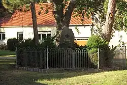 Auf dem Dorfplatz von Micheln in der Nähe der Kirche steht das Denkmal unter Bäumen.