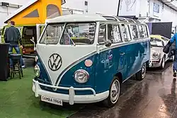 Der acht- bis zwölfsitzige Bus hatte 23 Fenster. Eine Heckklappe zum Innenraum gab es bis zum Modellwechsel 1955 nur als Mehrausstattung gegen Aufpreis. Die beiden hinteren Eck- und die acht Dachfenster waren anfangs aus 4 mm starkem Plexiglas gefertigt. Das Heckfenster war größer als bei den anderen T1. Der Samba hatte ein Armaturenbrett in Fahrzeugbreite, das 1955 in modifizierter Form in die Serienfertigung übernommen wurde.[12] Der Zugang zur hinteren Sitzreihe wurde durch eine wegklappbare Rückenlehne des rechten Sitzes der mittleren Reihe erleichtert. Die hinteren Eckfenster wichen ab August 1963 einer geänderten Heckklappe mit einem größeren Fenster.[14] Bei Modellen mit vorderen Einzelsitzen war das Reserverad links über dem Motorraum angebracht.