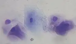 Kokkeninfektionen verursachen eine verstärkte Kernschrumpfung und Eosinophilie mit Pseudokeratinisierung. Bei einer Gardnerellen-Infektion liegen den Epithelzellen häufig staubzuckerartige Auflagerungen an.[23] Ein Scheidenpilz manifestiert sich zumeist in Pseudoeosinophilie, Zellzerfall („Masern- oder Fensterzellen“) und einem verwaschenen Hintergrund. Trichomonas vaginalis färbt sich mit den Routinefärbungen meist nur schlecht an, so dass der Erreger der Trichomoniasis mit den ähnlich großen Basalzellen verwechselt werden kann. Für dessen Nachweis ist die Phasenkontrastmikroskopie besser geeignet.[24] Herpes-simplex-Infektionen schädigen die Parabasalzellen. Hier treten Kernwandhyperchromasie, mehrere Zellkerne und Einschlusskörperchen auf.[25] Bei Humanen Papillomviren sind neben Kernwandhyperchromasie und zweikernigen Zellen auch Hohlräume im Zytoplasma („Koilozyten“) typisch.[26]