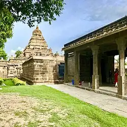 Der in großen Teilen von einer Mauer eingefasste Tempel besteht hauptsächlich aus einem großen leicht querrechteckigen Hauptbau mit drei übereinander angeordneten Cellae (garbhagrihas), dessen insgesamt pyramidaler aber horizontal mehrfach abgestufter Vimana-Dachaufbau mit einer großen „Schirmkuppel“ mit Kalasha-Spitze zu den großen Leistungen der Pallava-Baumeister gehört. Die Außenwand des Erdgeschosses des Tempels ist reich gegliedert und mit figürlichen Reliefs versehen.