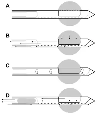 Im ersten Schritt wird das Biopsiefenster geöffnet, und ein Vakuumsog am Fenster der Nadel befördert das direkt anliegende Gewebe in das Innere der Nadel, wo es im zweiten Schritt von einem rotierenden Messer abgetrennt wird. Nun wird der Sog am Vakuumbereich 1 abgeschaltet, anschließend im dritten Schritt durch weiteren Sog im Vakuumbereich 2 und Herausziehen des Nadelkerns das abgeschnittene Biopsat zum hinteren Nadelende transportiert, wo es abgenommen wird. Dabei verbleibt die Nadel selbst in der Brust.