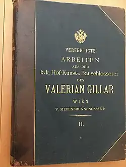 Einen Einblick in die Palette der Produkte aus Gillars Werkstatt an der Wende vom 19. zum 20. Jahrhundert vermittelt sein Preisbuch Mai 1899, von dem Exemplare in der Eisenbibliothek[9] und in der Staatsbibliothek zu Berlin[10] erhalten sind. Der Titel kündigt als Inhalt „Schmiedeeiserne Blätter, Tulpen & Rosetten“ an. Im Buch sind 39 Tafeln mit Modellen von „geprägten und weichgehämmerten schmiedeisernen Ornamenten“ enthalten, für die im Anschluss die Preise in österreichischen Gulden genannt werden. Dass Valerian Gillar nicht nur Wiener Kunden, sondern einen internationalen Absatzmarkt im Sinn hatte, deutet das Preisbuch Mai 1899 dadurch an, dass den Kunden angeboten wird, auf Französisch, Englisch und Tschechisch zu kommunizieren.