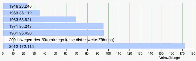 Die Bevölkerung des Distrikts Vavuniya wuchs jahrzehntelang überdurchschnittlich im Vergleich mit dem ganzen Land. Dies änderte sich kurz vor Beginn des Bürgerkriegs. Während des Krieges flohen zahlreiche Menschen aus den Kampfgebieten in das jenseits der Frontlinien gelegene Vavuniya, sodass sich die Einwohnerzahl des Distrikts beträchtlich vergrößerte. Dies führte zu einer wahren Bevölkerungsexplosion. Am Höhepunkt dieser Entwicklung lebten 2009 rund 207.000 Menschen im Distrikt. In der Zeit von 1981 bis 2012 (den beiden letzten Volkszählungsjahren) betrug das Wachstum 76.687 Menschen. Dies ist eine Zunahme von 80,4 % – trotz der Abwanderung von 90 % der indischstämmigen Tamilen in diesem Zeitraum. Die Einwohnerschaft hat sich seit der Unabhängigkeit mehr als versiebenfacht (+ 640 %).