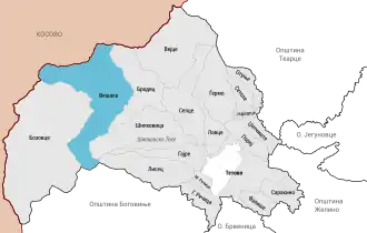 ![]() Karte mit der Lage des Dorfes (türkis) innerhalb der Gemeinde Tetovo (kosovarische Staatsgrenze rot) | |||||