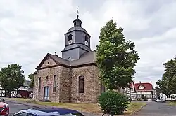 - die evangelische Kirche, ein 1778 bis 1780 im Übergangsstil vom Spätbarock zum Klassizismus errichteter, kreuzförmiger mit Sandstein verblendeter Fachwerkbau mit einem stattlichen Haubendachreiter in der Mitte. Das Innere ist mit dreiseitigen Emporen als Längssaal gestaltet. Die Steinsäulen der Emporen stützen gleichzeitig das Kirchendach. Die Treppen befinden sich in den räumlich abgetrennten Kreuzarmen. Die Orgel stammt aus dem Spätrokoko und wurde 1787 von Johann Stephan Heeren gebaut.