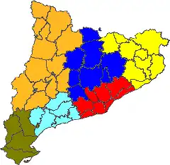 - Lleida, bestehend aus den Gemeinden der Comarques Les Garrigues, La Noguera, El Pla d’Urgell, La Segarra, El Segrià und L’Urgell. Diese Vegueria umfasst damit den Südteil der heutigen Provinz Lleida.
