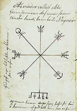 „Vegvísir. Hver sem ber á sér þessa stafi, villist ekki i stormi og illviðri, þótt ókunnugur sí.“