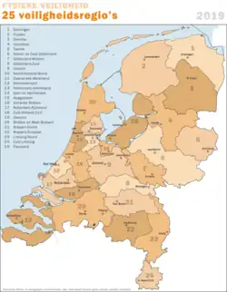 In den Niederlanden gibt es 25 veiligheidsregio’s (so der Plural). Eine Regio umfasst die Flächen von mehreren Gemeinden. In einer Provinz befindet sich mindestens eine Regio; größere Provinzen sind auf mehrere Regios aufgeteilt. Eine Regio hat einen Vorsitzenden; das ist normalerweise der Bürgermeister der größten Gemeinde. Die Vorsitzenden aller Regios arbeiten im veiligheidsberaad zusammen. Dieses Treffen hat einen Vorsitzenden und ein Büro.
