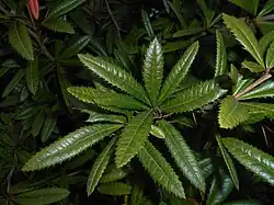Die fast sitzenden Laubblätter sind 6 bis 12 Zentimeter lang, eilanzettlich bis verkehrt-eilanzettlich oder elliptisch, lanzettlich, zugespitzt und stachelig gesägt, oberseits dunkelgrün, unterseits hell- bis gelbgrün. Der Blattrand ist knapp umgebogen.
