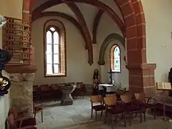 Bei der Restaurierung von 1896 entdeckte man unter den Chorfenstern eine übertünchte Weiheinschrift, legte sie frei und frischte sie 1970 auf. Sie stammt aus dem 14. Jahrhundert und gibt einen Text wieder, der wahrscheinlich im 12. Jahrhundert im kleineren Vorgängerbau des Chors angebracht worden war. Die Inschrift gibt als Weihedatum der Kirche den vierten Oktober 1170 an. Unterhalb der Inschrift stehen an der Ostwand des Chors Grabsteine aus dem frühen 18. Jahrhundert.