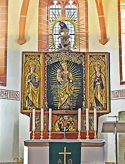 Der spätgotische Flügelaltar entstand um 1480 als Marienaltar in der Werkstatt von Hans Topher, auf den eine Inschrift im Mantelsaum der heiligen Katharina hinweist. Auf einer steinernen Mensa, an der noch Weihekreuze erkennbar sind, ruht auf einer Predella ein Triptychon. Das Gesprenge, das das Retabel bekrönte, ist verloren gegangen.