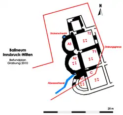 - Antiker Grabturm a.d. Gräberfeld Innsbruck-Wilten während der Freilegung, 1. Hälfte 3. Jh. (Heitmeier 2005 Taf. XV)