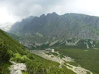 Die Velická dolina mit dem Berghotel Sliezsky dom, im Hintergrund der Seitengrat Velické granáty | ||