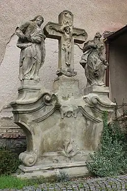 - Statuengruppe Kalvarienberg vor der Kirche; die 1761 aus rötlichem Sandstein gefertigte Figurengruppe mit Christuskreuz befand sich ursprünglich in Pňov-Předhradí.