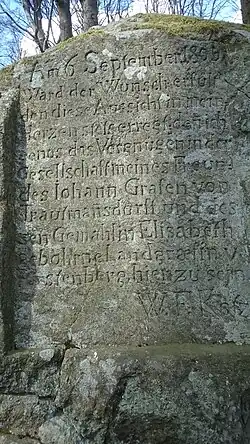 An der Westseite befinden sich mehrere in den Stein gehauene Tafeln aus den Jahren 1800 bis 1896. Diese tragen Inschriften, die an gemeinsame Ausflüge der befreundeten Adligen aus dem Geschlecht der Kotz von Dobrz und der Trauttmansdorff auf den Zvon erinnern.[4][5]